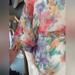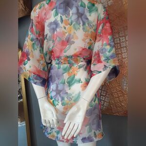 Vibrant floral sheer vintage kimono style robe with a mix of watercolor florals. Perfect for layering. Can be worn as an overpiece or a robe over lingerie. Vintage piece from the 1980s from Godiva Lingerie. Excellent condition, no flaws to note. 3/4 sleeves with matching self tying belt. polyester chiffon fabric, size medium, will fit small as well! See flat lay measurements below!