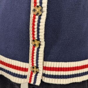 Classic vintage GAP cardigan in size Extra Small. Navy blue cotton knit with red, white, and blue striped trim for a timeless, collegiate preppy look. Features a V-neckline, tortoiseshell-style buttons, and long sleeves. Soft and comfortable, made from 100% cotton.