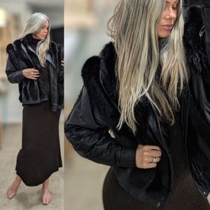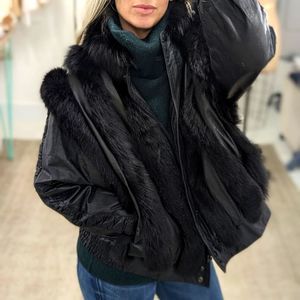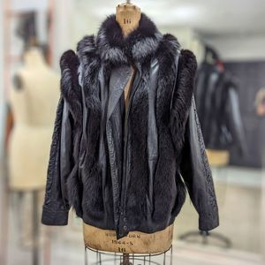 Fox fur & leather bomber. Raglan sleeve construction with pleated leather strip detail down center. Pockets. Heavy duty front zip + snap closure. All in good working order.