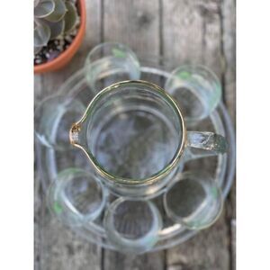 No chips or cracks. Jug shows some gold rim wear. 4 of 6 glass show no gold loss wear. 1 glass mild wear. 1 glass significant gold loss/wear.