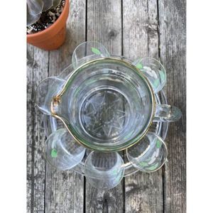 Vintage Handblown Glass Serving Set Jug & 6 Glass Hand Painted with Tray Gold Ri
