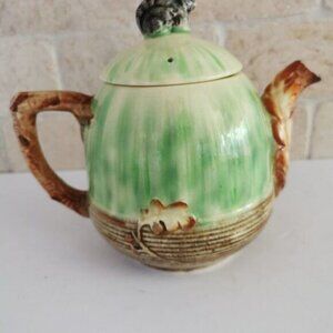 It is labelled as Handpainted, and has a green body with a brown rope or bamboo style ribbed markings along the bottom half. The spout and handle look like branches from a tree and there are lovely brown oak leaves decorating the teapot body.