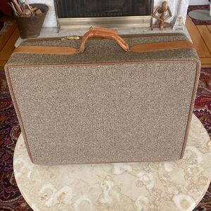 Rare vintage Hartmann Luggage travel suit yin excellent preowned condition. Features the classic quality Hartmann vachetta leather and wool tweed. Super comfortable leather carry handle, d-rings at both ends so you can attach the pull strap, it also has four fully rolling wheels. Comes with pull strap, lock and 2 keys.