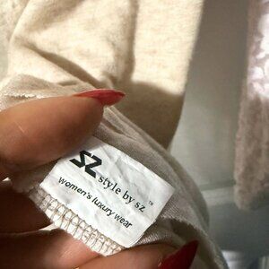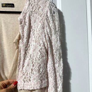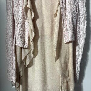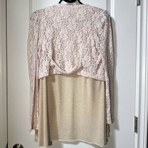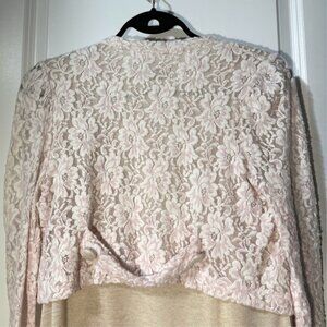 This unique piece features a light beige knit base with a light pink lace bolero-style overlay, giving the illusion of three layers — but it’s all one effortlessly chic design.