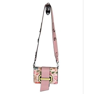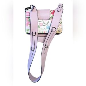 Color/Pattern: Pink base with multicolor floral print, pastel pink strap & flap closure with bold buckle detail