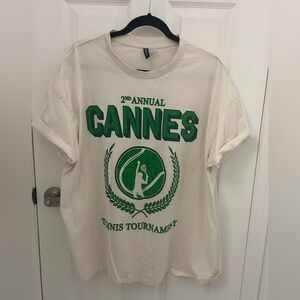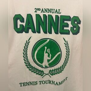 Off-white tshirt with vintage-inspired logo for Cannes Tennis Tournament in green. Excellent used condition and 100% cotton. Roomy fit, comfy shirt, great for summer. 25” pit to pit, 28” from shoulder to hem. H&M line Divided.