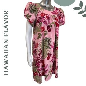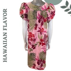 Add a pop of paradise to your wardrobe with this vibrant pink floral midi dress by Hawaiian Flavor. Featuring dramatic puff sleeves and a relaxed shift silhouette, this dress exudes tropical charm and carefree comfort. The bold leaf and flower print in red, green, and fuchsia makes this a standout piece for resort wear, summer lounging, or tropical-themed events. Lightweight cotton blend fabric offers breathability and ease of movement.