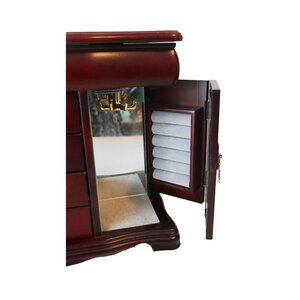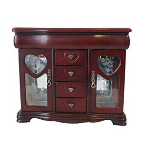 For consideration is an elegant wooden jewelry box which features a sophisticated heart design, mirrored panels, and velvet-lined compartments. Equipped with a revolving necklace holder, it's an ideal solution for organized storage while adding a touch of charm to your space. The rich wood finish enhances its timeless appeal.