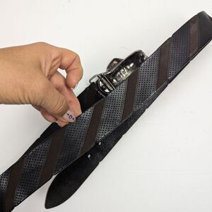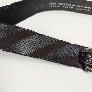 Unique vintage Italian belt by Quelli Della Pelle, handmade in Bellagio, Italy. Features a bold and collectible silver-tone convertible car buckle, paired with a diagonally striped genuine leather strap in black and brown tones.