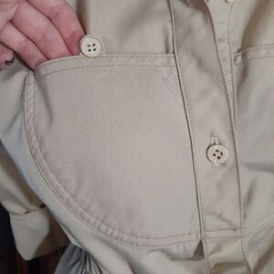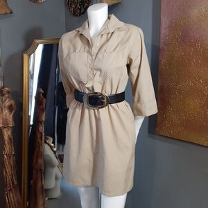 chic and rustic khaki coloured vintage utility mini dress. very good vintage condition. item from the 1980s. purchased at a reputable vintage consignment boutique in Hamilton Ontario. front breast pockets as well as side pockets. 3/4 cuffed sleeves with an elastic waist. collared button down front. pull over style. no size tag but I feel like this could fit a size xs or small best. see flat lay measurements below! no fabric tag but could be cotton or rayon. small discolouration on left sleeve, see pic.
