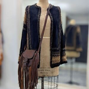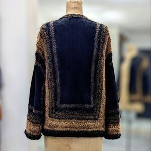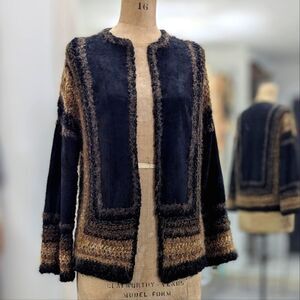 Light weight black suede panels knitted together with a blended camel, taupe & black wool/mohair.