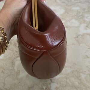 In practically new condition gorgeous vintage genuine leather satchel. Made in London England, rich brown leather exterior with gold tone hardware, opening mechanism works like a charm, interior is suede lined and super clean with a zippered pocket and three slip pockets. Original paper sealed compact mirror included.
