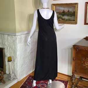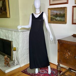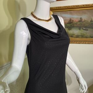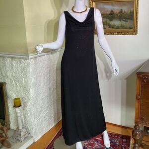 Lovely vintage Lori M maxi dress, all black with silver speckles, sleeveless, cowl neck, slight A line. Soft and light stretchy polyester fabric.