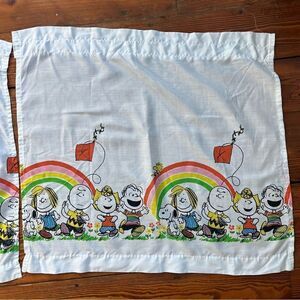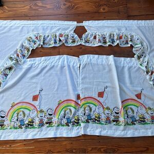 3 piece curtains set from the Peanuts. White background color that is slightly sheer. Has rainbows and peanuts gang in bright colors. The curtains measure 28" wide by 24.5" long each (Not including the 1.25" ruffle above the rod pocket)