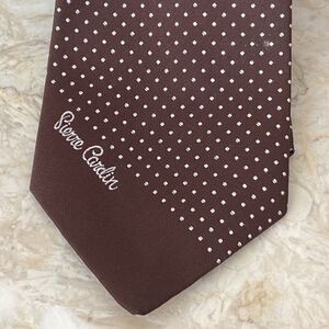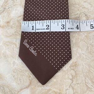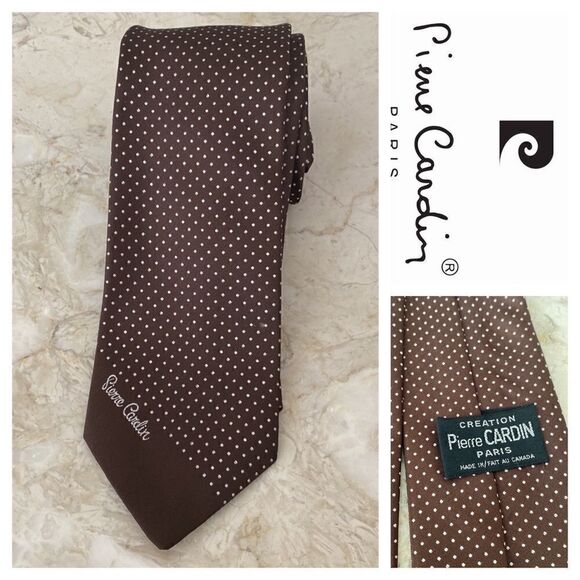 Cool vintage Pierre Cardin Paris polka dot silk tie. Brown background with small white polka dots, monogram at front.