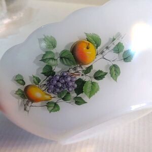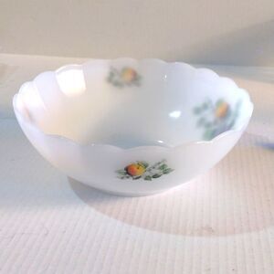 This is a very nice set of two Arcopal France milk glass nesting bowls. The design is called Fruits De France and depicts grapes, apples and pears with branches and foliage. Each bowl is even more elegant with the scalloped edge detail. There is no wear on the pictures and both bowls are in excellent pre-owned condition. The bowls measure 9”and 8” in diameter.
