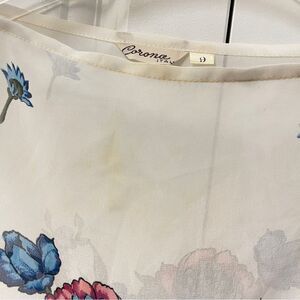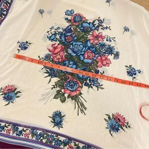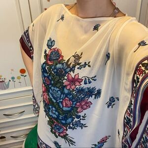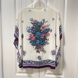 Stunning and airy vintage silk poncho blouse with a romantic floral print in burgundy, periwinkle blue, and soft pinks on a creamy background. Effortlessly elegant with a relaxed, flowing silhouette – perfect for channeling coastal grandma chic. Can be belted or worn loose for a breezy kaftan vibe.