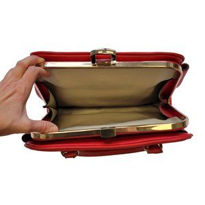 This is a beautiful vintage-style Enzo Bertini red leather shoulder bag or cross-body bag (depending on how you want to wear it) with handles and a removable strap. It has 3 different inner compartments to fit all your essentials and more. It has a top gold hard metal clasp closure. This is a quality bag made in Italy.