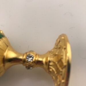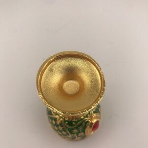 Beautiful small vintage-style decorative chalice/goblet featuring a rich green enamel body with gold detailing and an ornate red gemstone centerpiece. The inside is finished in a shiny gold tone, giving it an elegant, royal look. Perfect as a display piece, altar décor, cosplay prop, or collectible.Condition: New