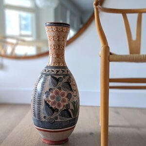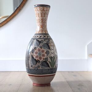 Signed large handmade clay floor pot. Stunning subdued mix of terracotta, off white, blue grey.