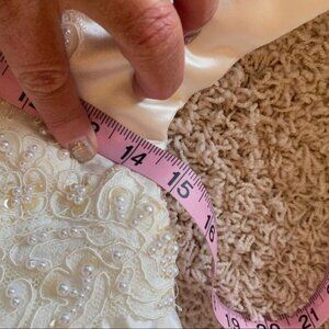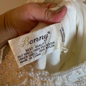 Circa 1989 winter white radiant 85” triple cathedral train wedding dress, exquisite beaded bodice, dazzling bustle, plunging neckline, double keyhole back, artistic beaded sleeves, OBO