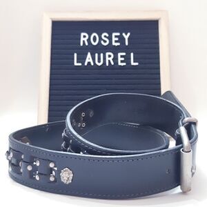 Vintage unisex Versace Versus leather belt with four of those unmistakable signature lion's heads studded along the length guarding either side of 2 brad studded woven sections. Excellent preloved condition. Silver metal hardware. Thick and sturdy leather belt. Total belt measures 44 inches from top tip of buckle to tail end.