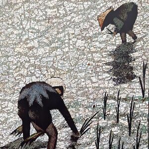Image search suggests circa 1950 lacquered eggshell art depiction of a rice field.