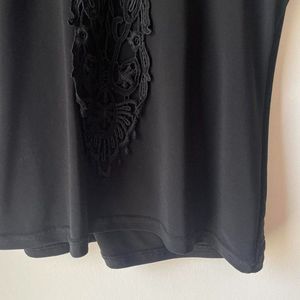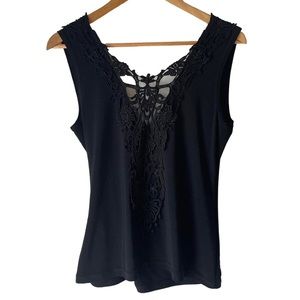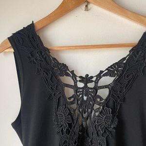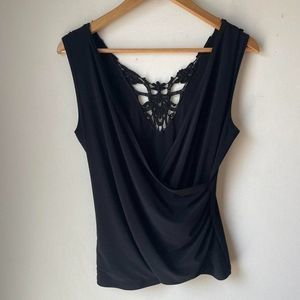 Vintage Y2K fairycore black stretch tank top with low V crochet front and draped back.