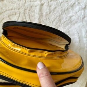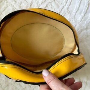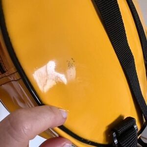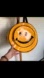Plastic yellow happy face backpack, with two compartments.