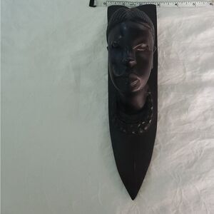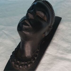 Dark teak wood African woman's head with beaded necklace bust plaque wall hanging.
