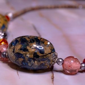 Lovely necklace with a vintage look, has wooden beads, silver colour pieces and epoxy resin egg shaped heavy pieces.