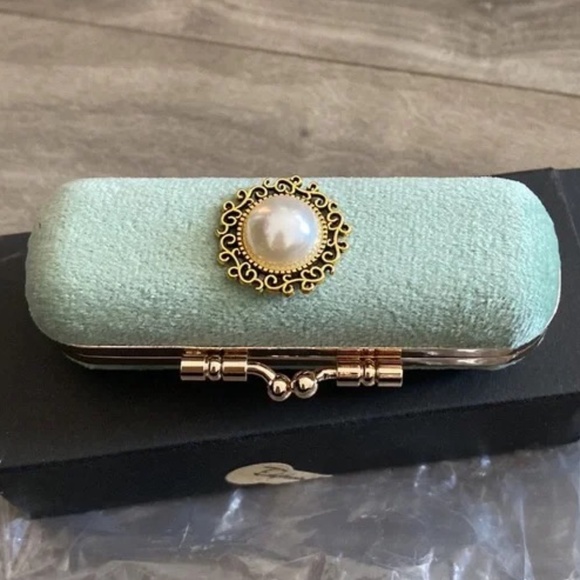 Nearly new, very good vintage-style lipstick case: Velvety material, inside/outside. Fits a regular size lipstick. The mirror looks blurred because there is still has the plastic covering in it, unpeeled.
