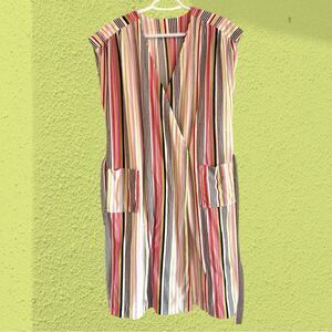 Adorable vintage swim cover/ robe. Short sleeve style with snap clasp closer and waist tie, large pockets, pink, green, black and white stripes on thin terry cloth.