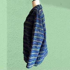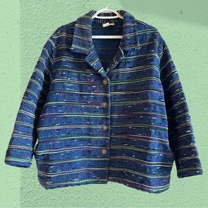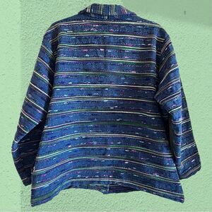 Cute vintage blanket jacket. It’s a thick unlined blue canvas with colourful textured detail. Collared with buttons and side pockets. Size XL, fits true to size. Excellent condition.