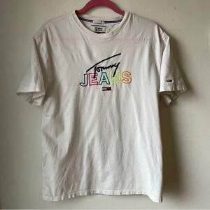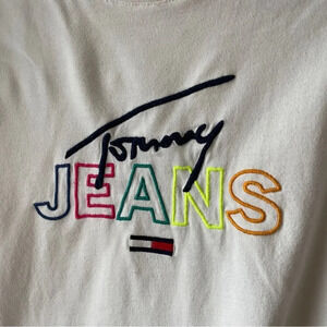 Vintage 90s Tommy Hilfiger / Tommy Jeans white T-shirt with embroidered neon writing and logo.