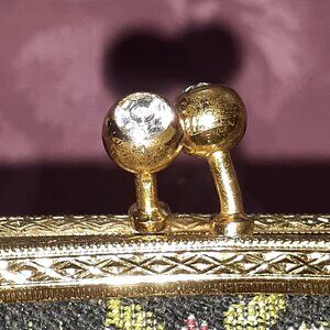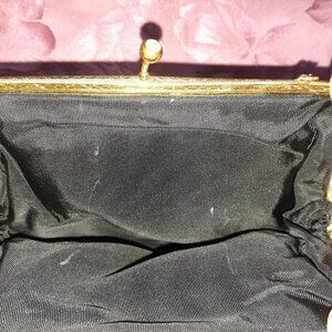 Small 6" by 5' inch (153mm X 127mm) tapestry purse/ Rose Pattern on both sides/ Black interior/Gold colored frame with snap clasp (Faux Stone inside/ Chain strap.
