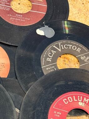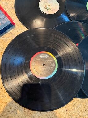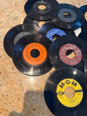 set of about 20 vinyls that most likely don’t work - some might? But these are used for decor. Photos show imperfections, scratches, glue for placing on wall.