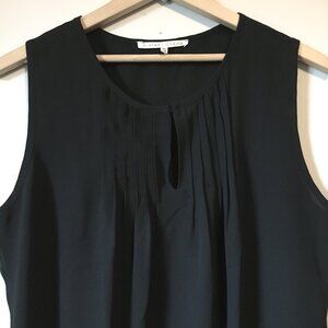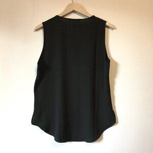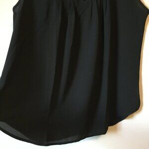 Very good preowned condition, black, sleeveless blouse with single button closure at the collar with tiny keyhole opening below by Violet & Claire. Made of lightweight chiffon, this top is perfect for layering and simplicity.