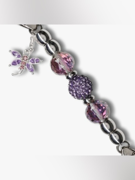 Elegant silver-tone Keyfinder featuring faceted purple crystal beads and a sparkling pavé purple centerpiece. Includes a delicate dragonfly charm with purple accents. Adds a touch of feminine sparkle to everyday and special occasion looks.