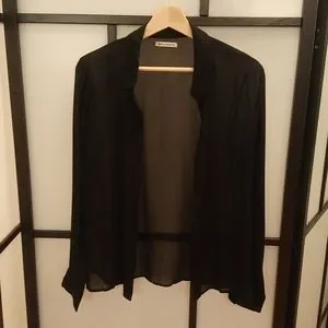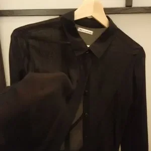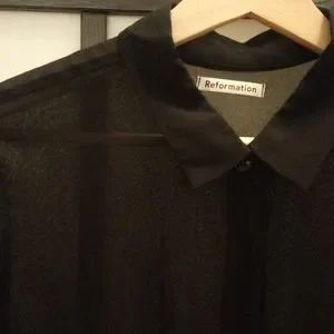 Elegant, attractive and versatile sheer dress shirt (button down) from Reformation. Can be dressed up with a leather pencil skirt or dressed down with jeans or jean shorts or experiment with black overalls. Never worn because I bought it online and the colour is not working with my skin tone (olive-ish). Would fit a size 4 or 6.