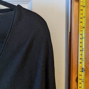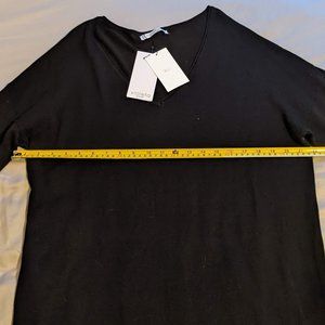 Love this brand, super inclusive and great plus sizing. This dress is so soft and feels great on. Beautiful black dress with double volume sleeves. measurements in pictures, from website :Bust 38.58", Waist 30.71", Hips 41.73". 85% viscose, 15% wool