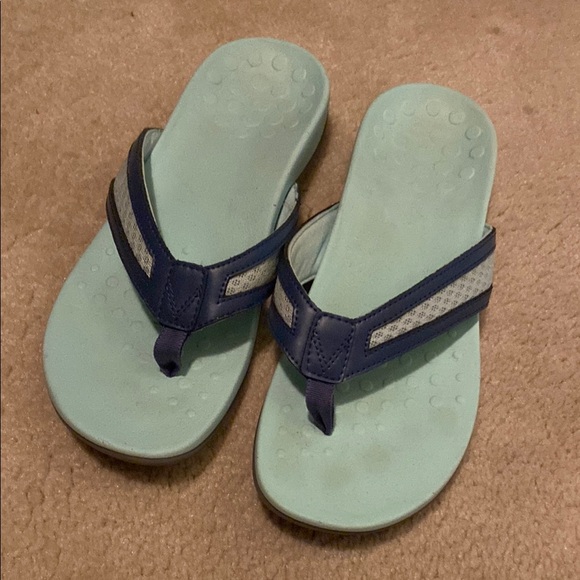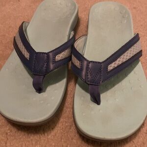 Comfortable Vionic sandals with a light blue footbed and navy straps. Great condition.