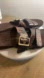 Front strap has a hook & loop closure. Back strap has a gold toned buckle.