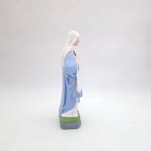 A vintage plaster statue depicting St. Mary with the immaculate heart. It has Mary in blue and white standing atop a green surface. From its appearance I think that someone bought an unpainted statue and painted it at home. There is wear as in the pictures.