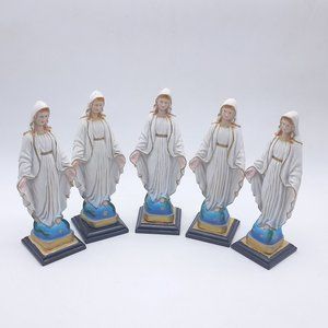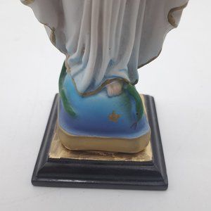 A resin statue depicting the Immaculate St. Mary, vintage but unused -I have 5 available. It has Mary in blue and white standing atop a a blue orb with stars, presumably representing heaven; her feet are crushing a serpent. It was made by Creations Bella, who provide statuary to St. Joseph's Oratory in Montreal and other religious institutions. They discontinued the statue years ago leaving it in the upstairs of their warehouse where I was lucky enough to scoop them up.