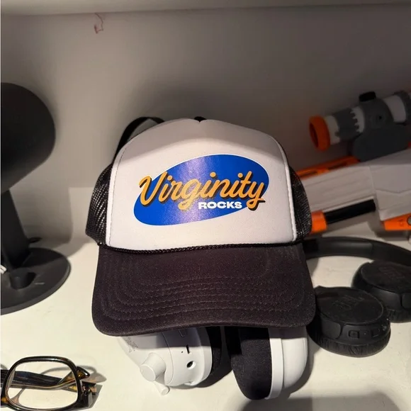 Trendy black and white cap featuring a bold 'Virginity Rocks' design. Ideal for casual outings. Never worn, came in mystery box.
