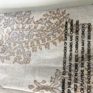 Small bhuti flowers made extra-deluxe in paisley scrollwork. The lovely intricacy of the blocks is highlighted with gold and silver, then toned down a bit on natural linen. Evenly placed with generous space to allow its stateliness to shine.