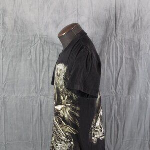 Up for slae is a vintage Rock Chang graphic t-shirt. It has a black base colour with a graphic of 2 bald eagles with a motorcycle screened on both the front and back of the shirt. What a great shirt do not miss out on it.