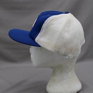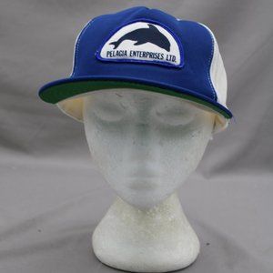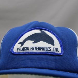 Up for sale is a vintage patched trucker hat. It has a blue front and brim with a white mesh back. The front of the hat has a patch crested on for Pelagia Enterprises and the patch is highlighted with a dolphin across the top. What a great vintage do not miss out on it.