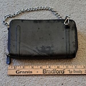 Vintage black leather wallet with a stylish chain, perfect for everyday use. Chain is removable. Leather is distressed. Can be used as a large wallet or small clutch.
